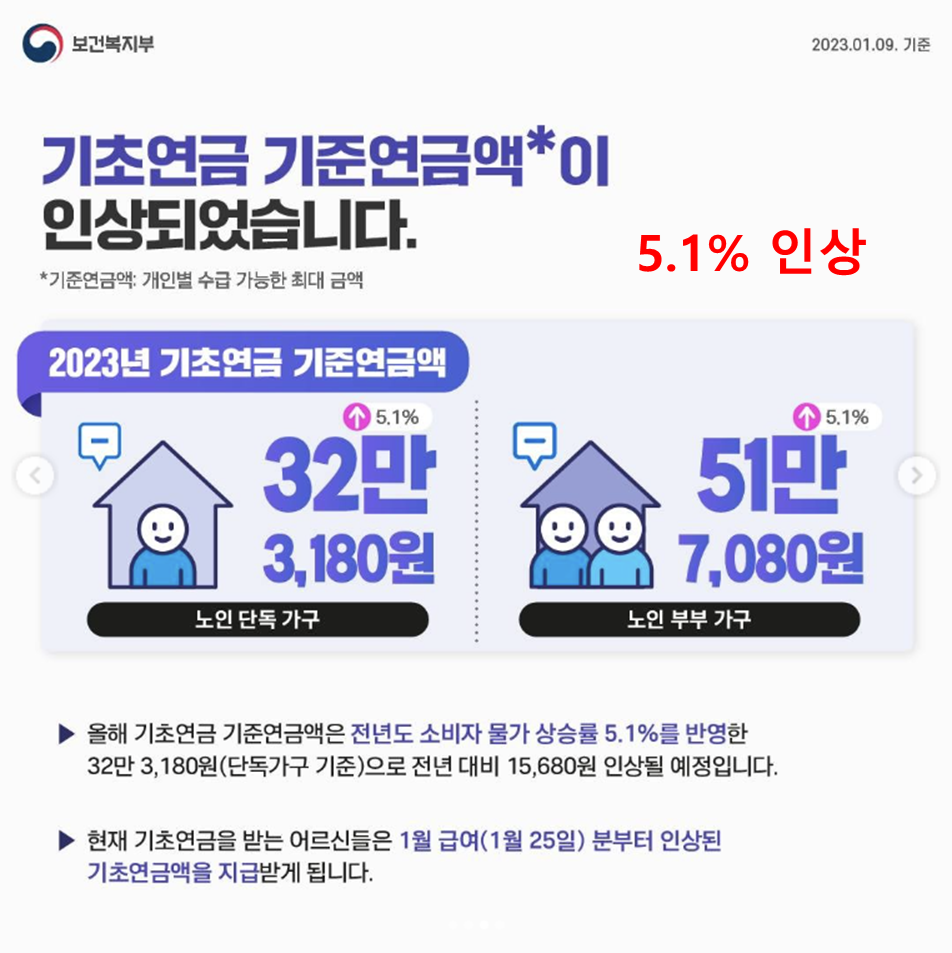 2023년에는 기초연금이 5.1% 인상되어 단독 노인 가구는 320,000원, 부부 노인 가구는 510,000원을 받게 됩니다. 이는 소비자 물가 상승률을 반영한 조치로, 수급자들은 2023년 1월 25일부터 인상된 금액을 받을 수 있습니다. 노인들의 경제적 부담을 덜어주는 중요한 변화입니다.