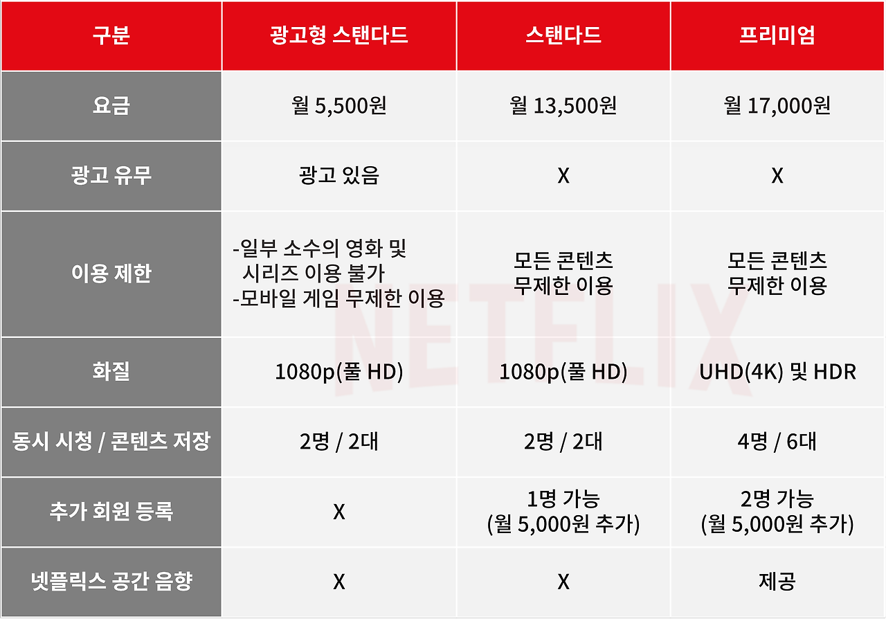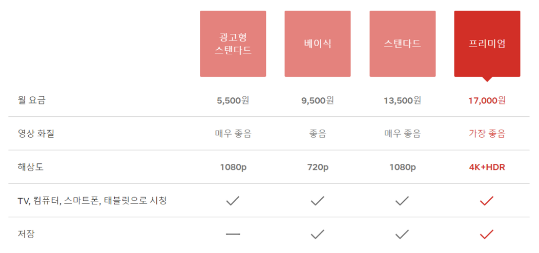 - 프리미엄 : 월 17,000원으로, 최대 4대의 기기에서 동시에 스트리밍이 가능합니다. UHD(4K) 화질을 지원하며, HDR 기능도 포함되어 있습니다.