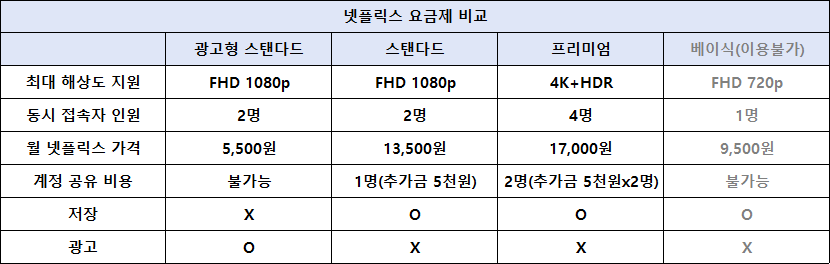 - 베이식 : 월 7,900원으로, 광고가 없고 한 대의 기기에서만 스트리밍이 가능합니다. 화질은 FHD(720p)입니다.