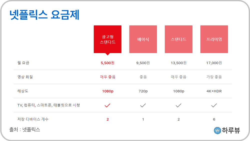 - 스탠다드 : 월 13,500원으로 두 대의 기기에서 동시에 스트리밍이 가능합니다. 화질은 FHD(1080p)로, 광고가 없습니다.