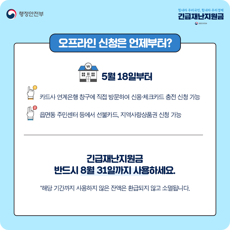 - 오프라인 신청은 주민등록 주소지 행정복지센터에서 가능합니다.