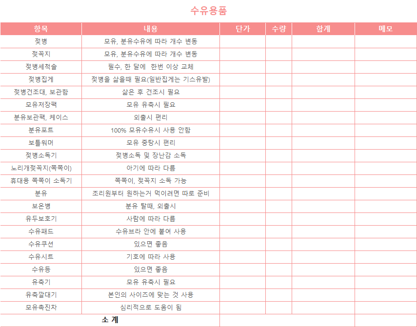 - 의료 용품 : 병원에서 필요한 서류, 개인 위생 용품, 수유 패드 등