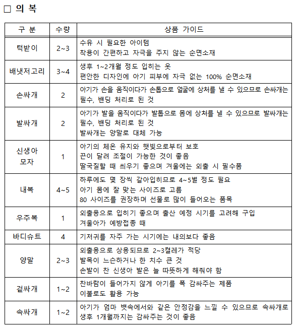 - 아기를 위한 물품 : 아기 옷, 기저귀, 아기 담요