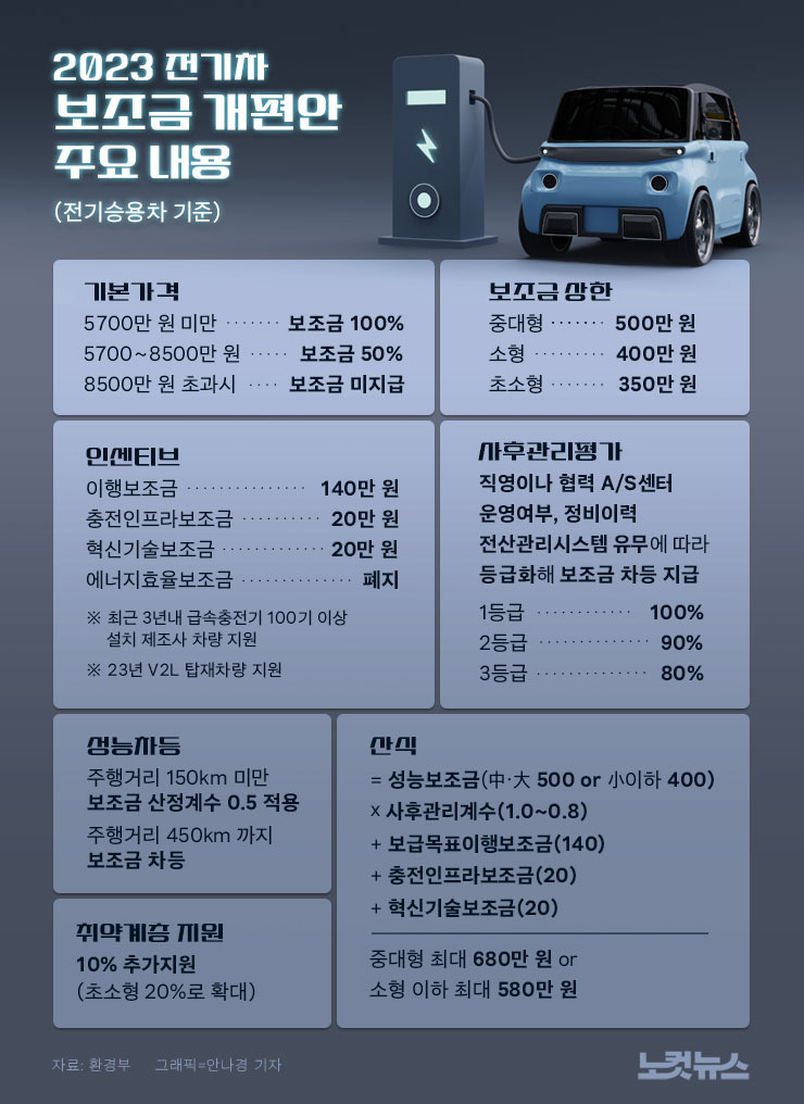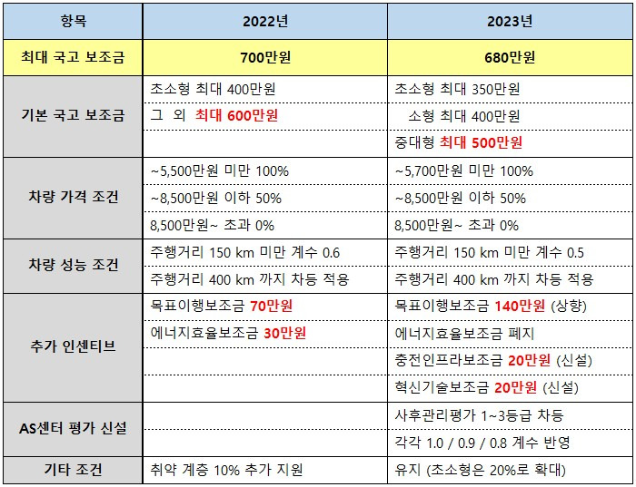 2023년에는 전기차 보조금이 일부 변경되었습니다. 예를 들어, 최대 국가 보조금이 2022년 70만 원에서 68만 원으로 감소했습니다.