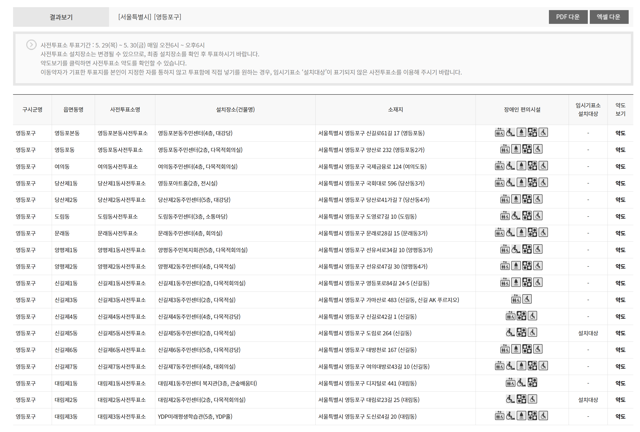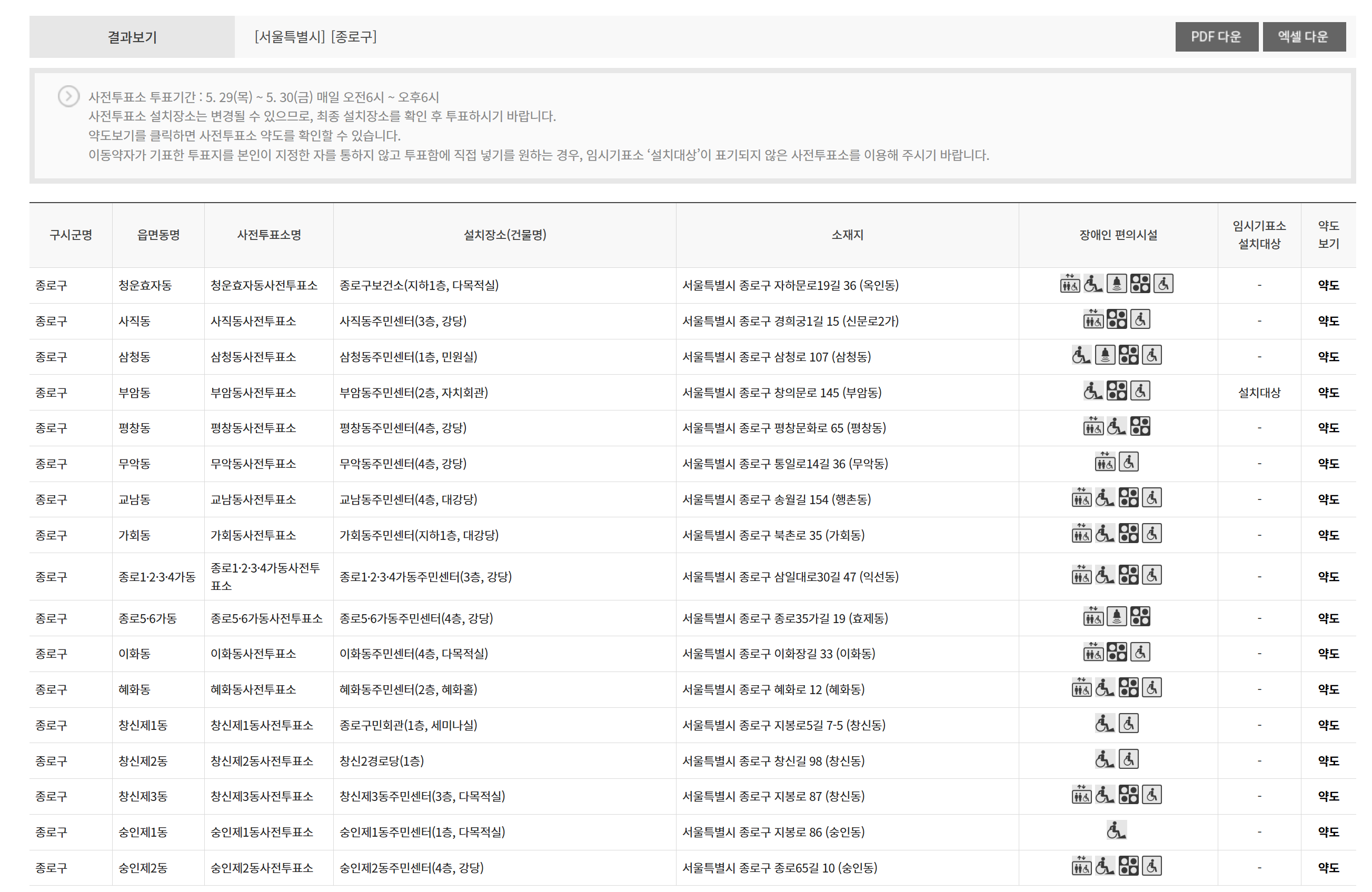 기본 현황 > 사전투표소 현황으로 지역 찾기