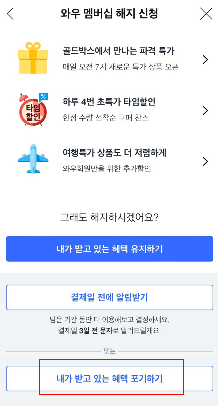 - 와우 멤버십 해지 선택 : '와우 멤버십 해지하기' 옵션을 선택합니다.