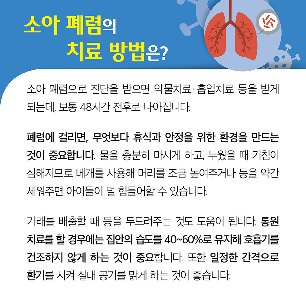 폐렴의 치료는 원인에 따라 다릅니다. 세균성 폐렴의 경우 항생제가 필요하며, 바이러스성 폐렴은 대개 증상 완화에 중점을 둡니다. 또한, 충분한 수분 섭취와 휴식이 중요합니다. 심한 경우에는 입원 치료가 필요할 수 있으며, 호흡기 치료나 산소 치료가 필요할 수 있습니다.