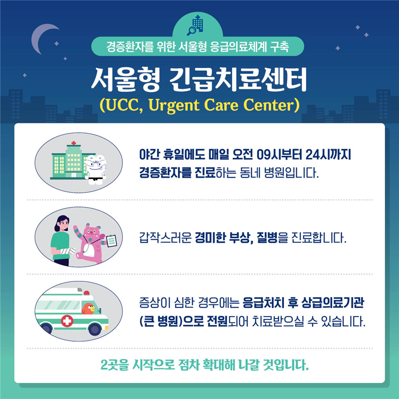 서울에 거주하시는 분들은 서울 긴급 치료 센터(UCC)를 이용할 수 있습니다. 이 센터는 매일 오전 9시부터 자정까지 운영되며, 급성 질환이나 부상으로 인한 응급 환자를 위한 치료를 제공합니다. 심각한 경우에는 대형 병원으로의 전원이 가능하니, 필요할 경우 적극적으로 이용하시기 바랍니다.